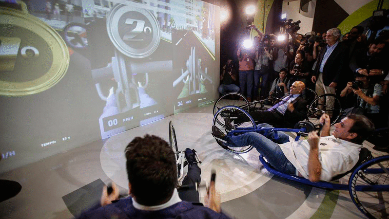 projeto contou com três handbikes reais, adaptadas com sensores eletrônicos, conectadas a um jogo de corrida virtual.
